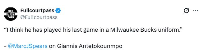 北京时间1月27日,雄鹿队球星字母哥正处于小腿拉伤的恢复期,此前他曾预估自己可能会缺阵4至6周,目前其确切复出时间仍未可知。名记Spears在节目上表示:“我认为他已经打完了身披密尔沃基雄鹿队球衣的最后一场比赛,”
