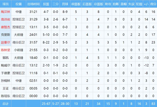 本场比赛,山东队共4人分上双,珀塞尔23分5篮板3助攻5抢断,陶汉林16分8篮板,克里斯17分4篮板,高诗岩14分4篮板7助攻。近期表现不俗的小将王证仅获得5秒上场时间。此外,两名小外援本场手感冰冷,合计32投10中,砸歪篮筐。