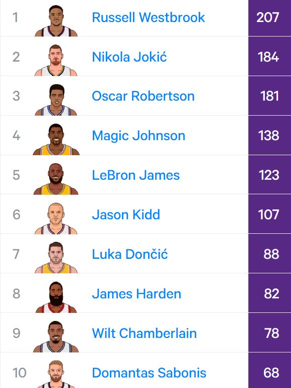 NBA历史三双榜最新排名出炉,前五分别是: