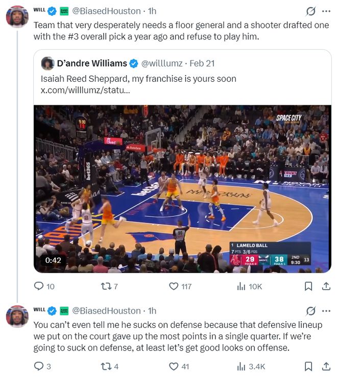 休媒:火箭队很需要一位防守型中锋与一个投手,一年前他们用探花签选中了投手,可关键时刻却不让谢泼德登场。你总是说谢泼德防守端表现糟糕,可我们此役是输在进攻端,单节丢33分还考虑防守吗?至少让球队在进攻端有所作为吧。