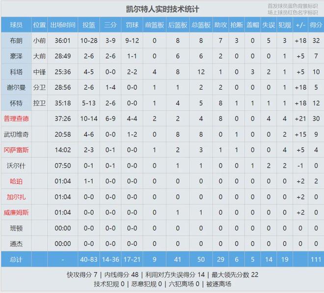 凯尔特人替补合砍45分,普理查德独得30分4篮板8助攻,湖人替补加起来25分!杰伦-布朗28投10中,砍下32分8板7助3断,他跟普理查德合砍62分。湖人东契奇25分5板3助、詹姆斯20分4板5助2断、里夫斯15分7板2助2断。