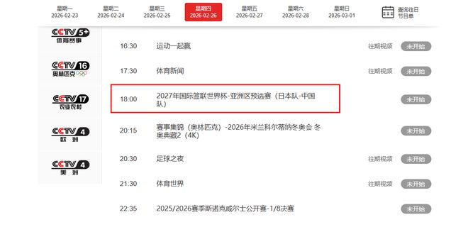 根据赛程的安排,CCTV5直播将在2月26号晚上18:00全程直播,国内球迷们有福了。