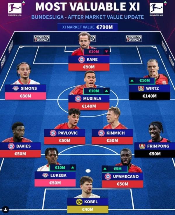 德转列德甲最贵阵:穆西亚拉领衔拜仁6将,维尔茨、西蒙斯在列