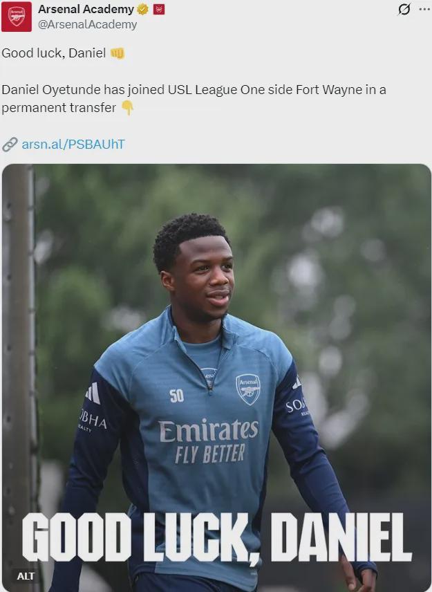 官方:阿森纳宣布丹尼尔-奥耶通德转会加盟了USL League One(美国职业足球的低级别联赛)的Fort Wayne俱乐部。