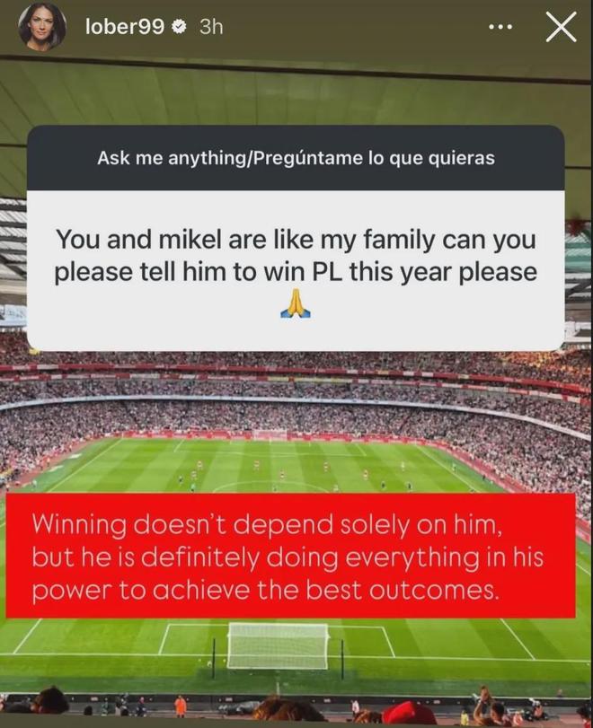 阿尔特塔的妻子Lorena在IG上发图文回应了球迷的提问,这名球迷表示“你能不能告诉阿尔特塔,请拿下今年的英超冠军”。