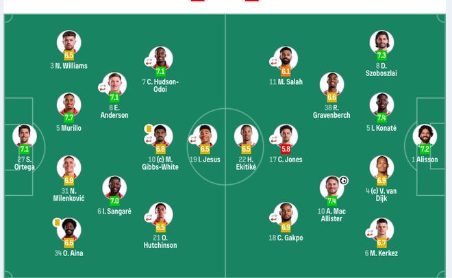 诺丁汉森林首发:27-奥尔特加、5-穆里略、31-米伦科维奇、34-埃纳、3-内科·威廉姆斯、6-桑加雷、8-埃利奥特·安德森(75’20-卢卡)、21-哈钦森(61’29-巴卡瓦)、10-吉布斯·怀特、7-奥多伊(61’14-恩多耶)、19-伊戈尔·热苏斯(75’16-多明戈斯)。