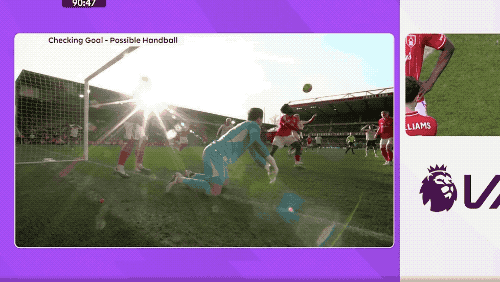 第90分钟,恩古莫哈传中,埃基蒂克的头球被奥尔特加奋力扑出,埃纳大脚解围,麦卡利斯特背身,皮球打在他的手臂上,弹进球门。VAR介入,裁判认定进球无效。