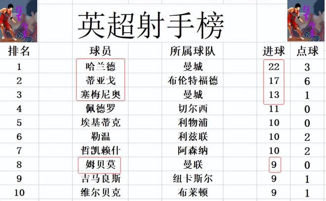 射手榜方面,哈兰德22球领跑,蒂亚戈17球排在第2,塞梅尼奥13球位列第3。姆贝莫今天未能进球,还是和吉马良斯,维尔贝克9球刚好挤入前十。谢什科错失梅开二度良机,还差2球才能进前十。