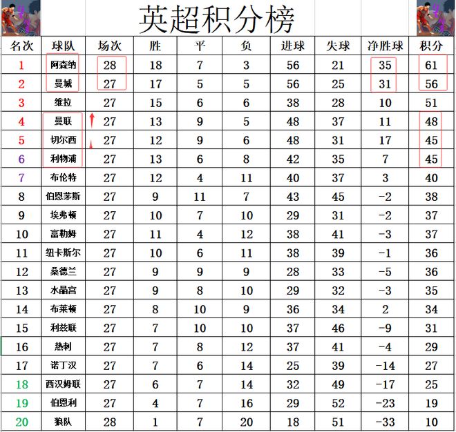 积分榜方面,阿森纳多赛一场,领先曼城5分,阿森纳要想打破20多年的冠军荒,最后10轮就不能再像以往一样掉链子,毕竟多一场多5分,优势并不算太大。曼联今天准绝杀赢球后,超过切尔西,利物浦3分,重回前4,落后第3的维拉3分。